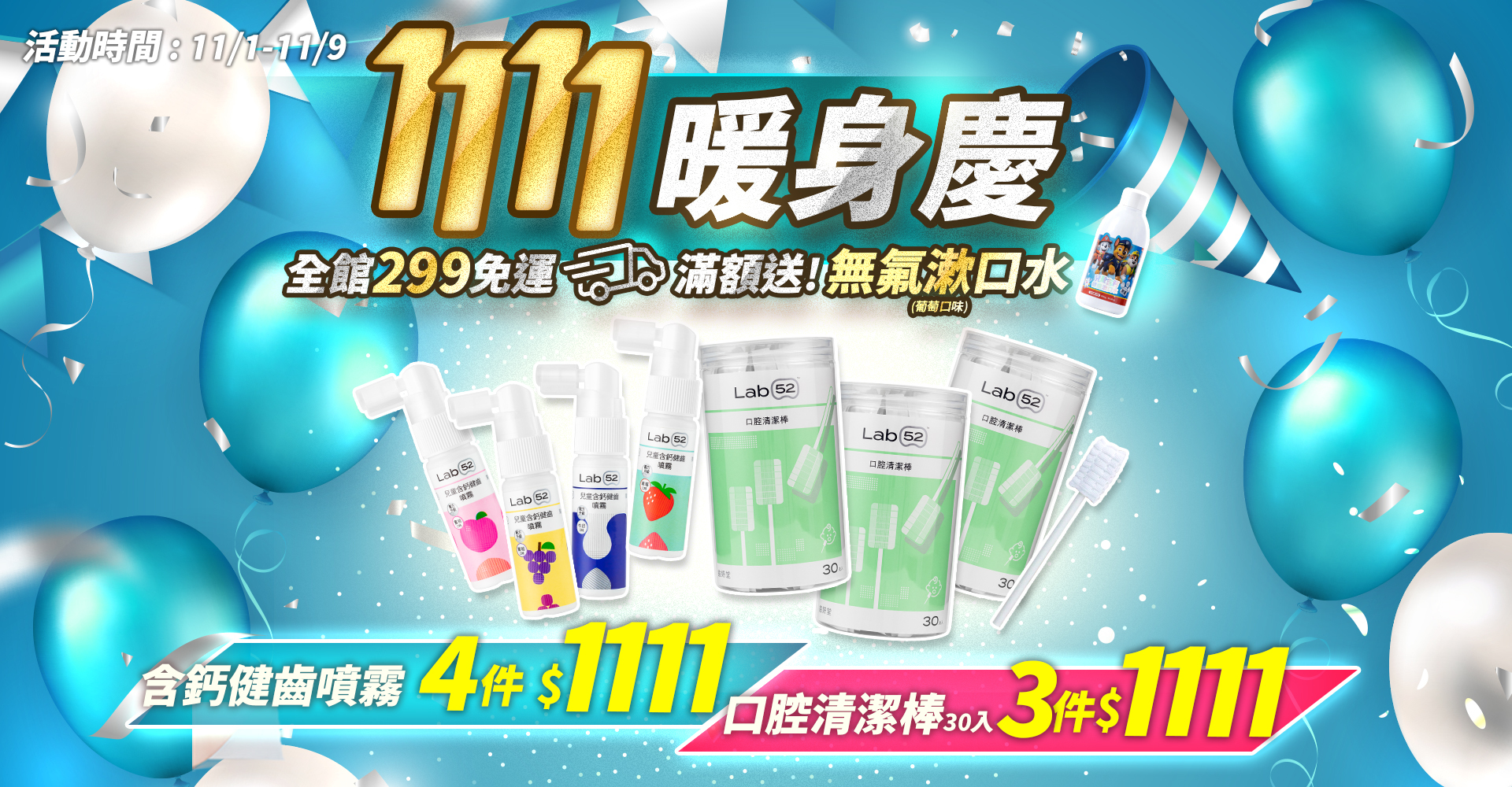11/1-11/9 全館實際結帳金額買$1111贈兒童無氟漱口水(葡萄口味)300g一瓶