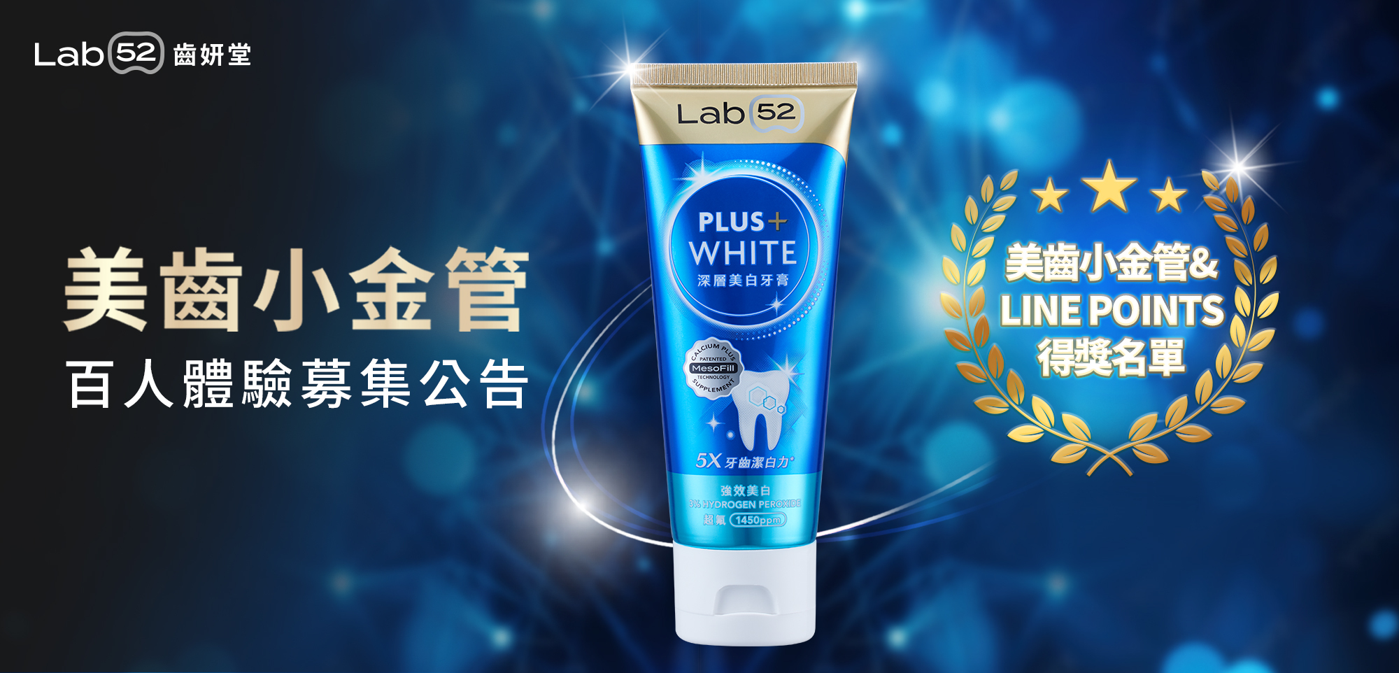 感謝齒粉們於2024/8/19(一)~9/1(日) 於官方LINE上參加 "Lab52齒妍堂-深層美白牙膏 百人問卷體驗募集,因應調查需求,本活動由拓華生技股份有限公司進行篩選。符合資格者將寄送新品做體驗使用。