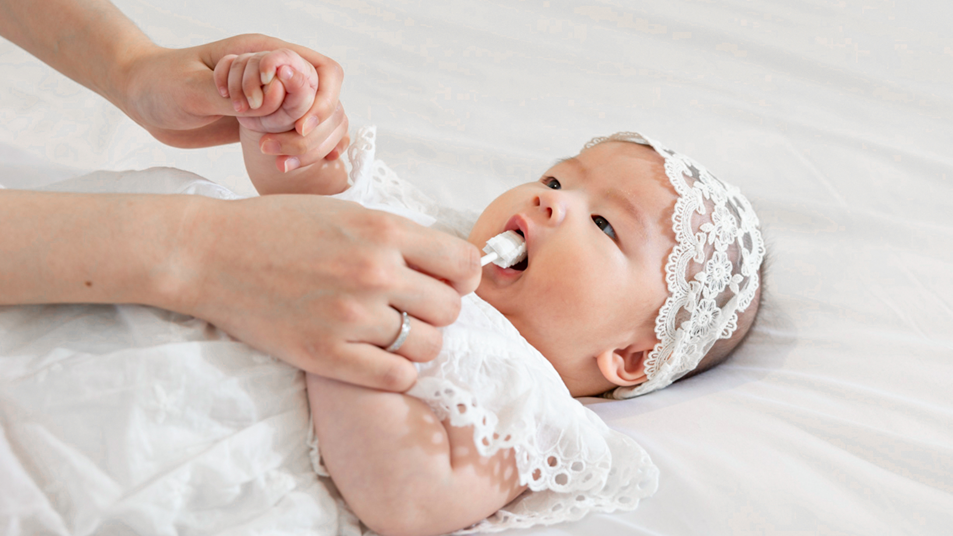 輕輕按摩寶寶的牙齦、舌頭和臉頰內側,這樣就能把口中的奶垢清理乾淨。這動作看起來簡單,但意義重大,不僅可清除細菌,還能讓寶寶逐漸習慣嘴巴裡有東西動來動去,等到開始長牙時,就不會那麼抗拒刷牙了