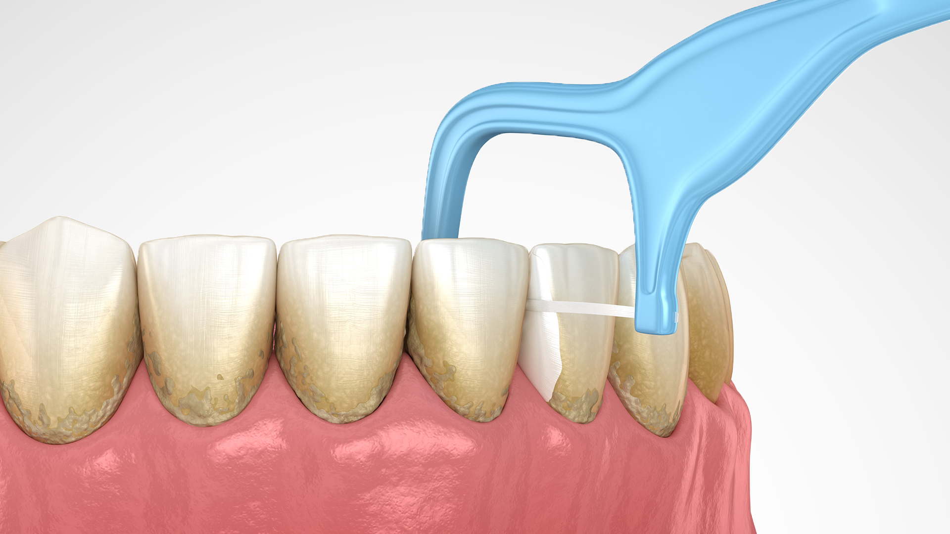 步驟二: 牙線/牙線棒靠在其中一顆牙齒呈C字或反C字形往上刮除。