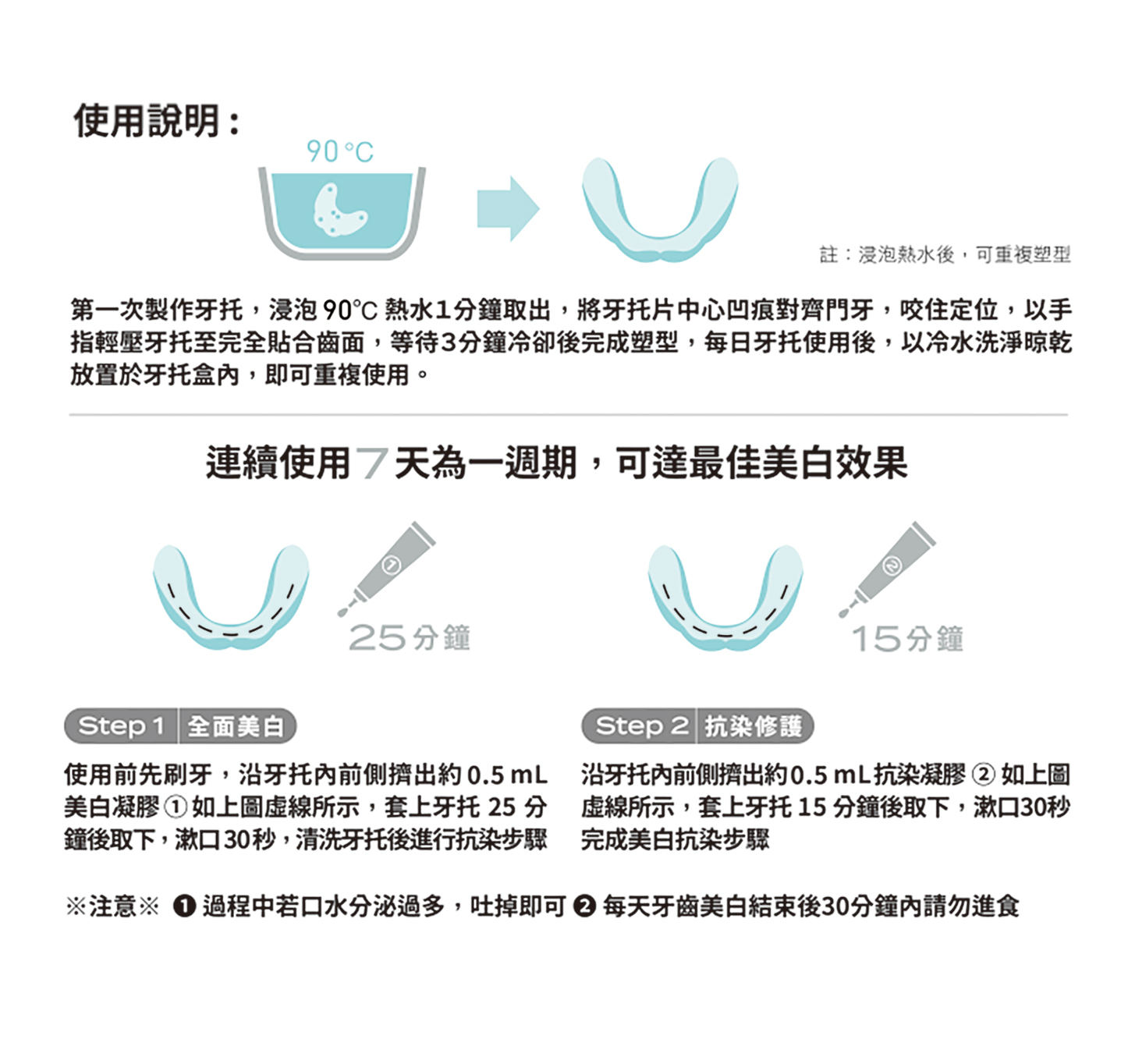 因牙托為符合多數男女口腔大小設計,有些口腔較窄小的使用者,可能會有牙托過大的情況,建議可以在塑型後,以乾淨剪刀將多餘處剪除,療程時就不會有頂到口腔後側,不舒服的感覺囉!